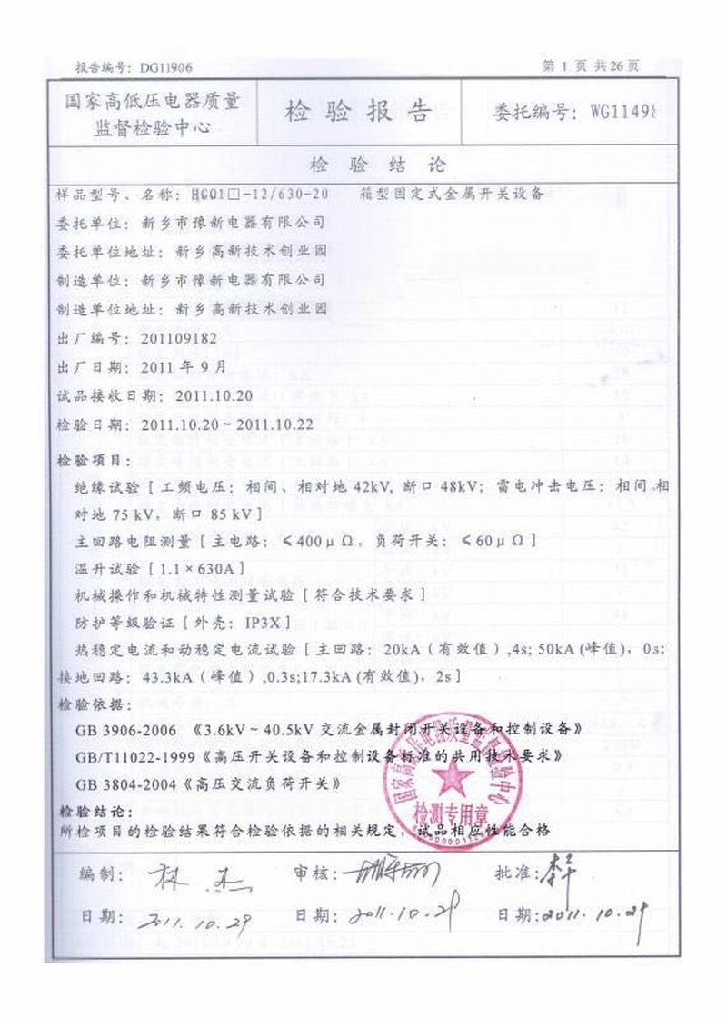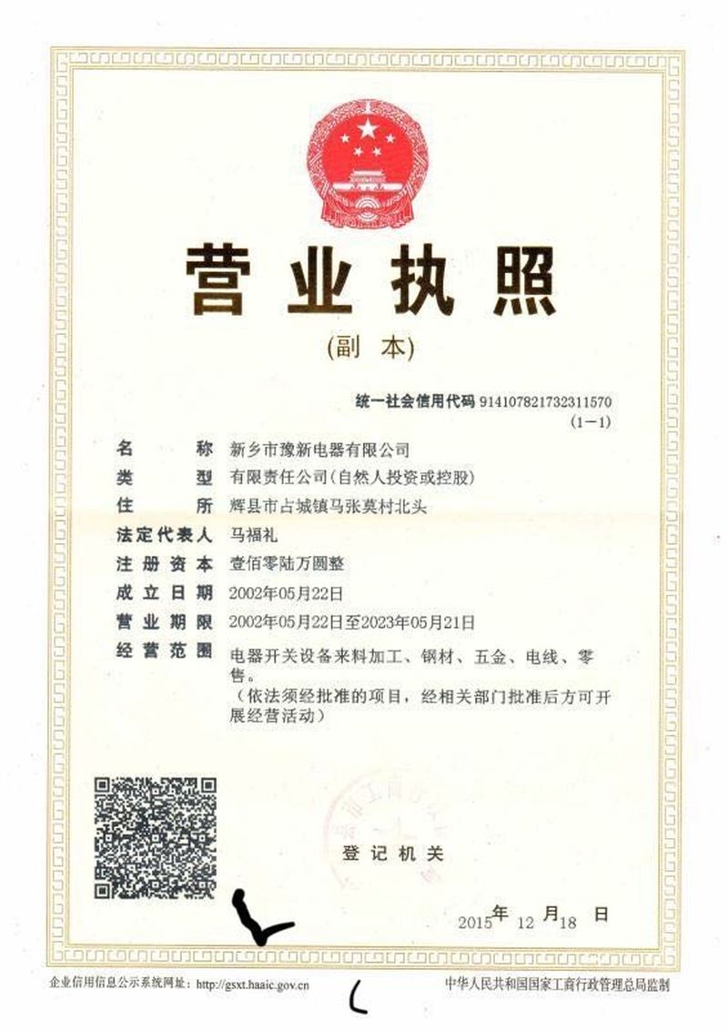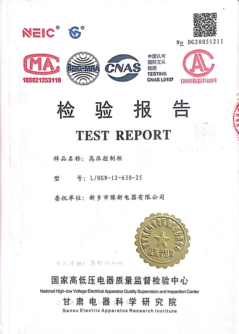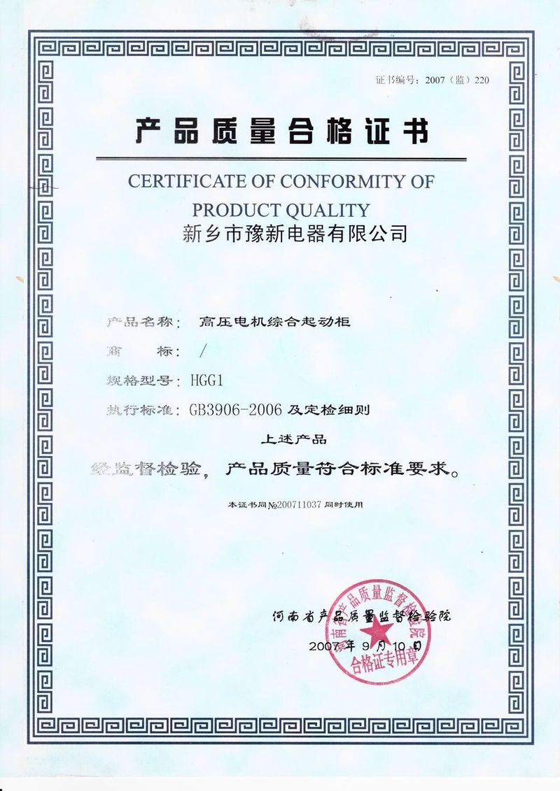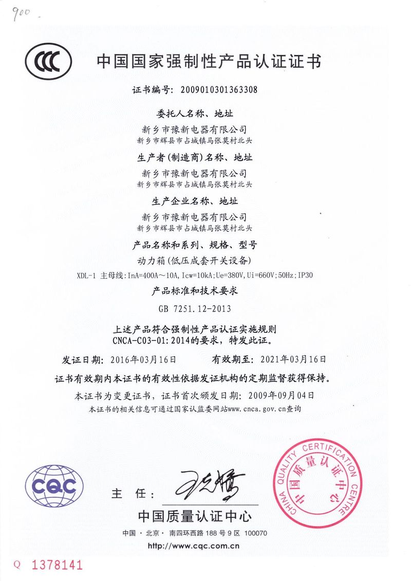 已通過ISO9000國際質量管理體系認證;產品注冊‘豫新’牌商標,低壓動力控制柜通過國家強制性CCC認證,低壓降壓啟動柜曾經天津低壓電器研究所、蘇州電器研究所有限公司檢測合格